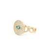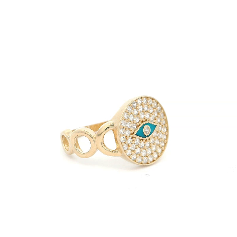 Este exquisito anillo de oro presenta un cautivador diseño de mal de ojo, incrustado con circonitas brillantes que captan la luz de manera brillante.
