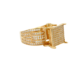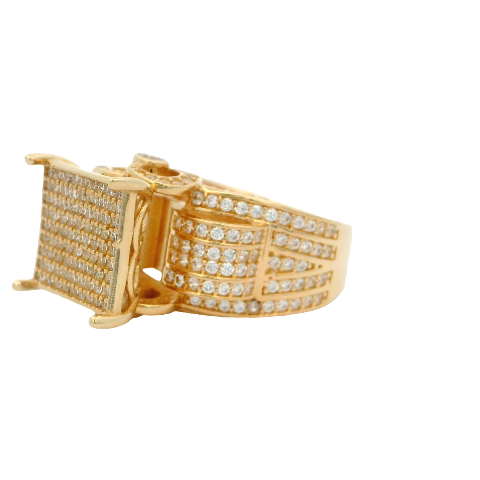 Este impresionante anillo de oro presenta una gran cara cuadrada con deslumbrantes circonitas incrustadas.
