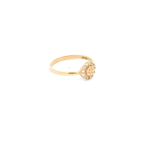Este exquisito anillo de oro presenta una pieza central redonda brillante, rodeada por un halo de circonitas brillantes.