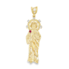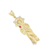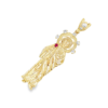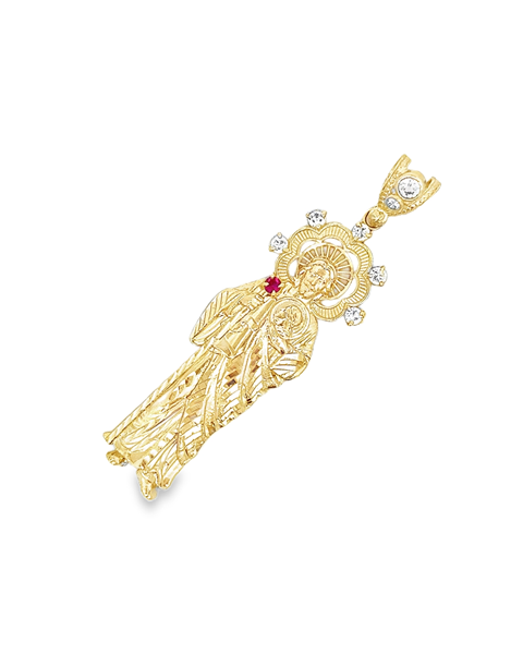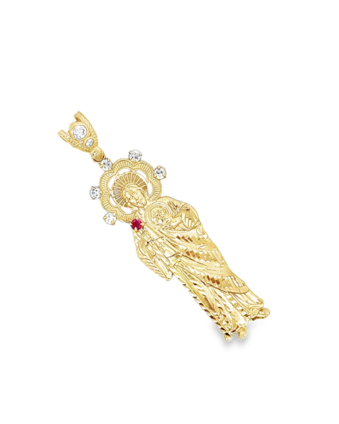 Este exquisito colgante de oro presenta una representación detallada de un santo, adornado con circonitas brillantes y un toque de rojo vibrante.